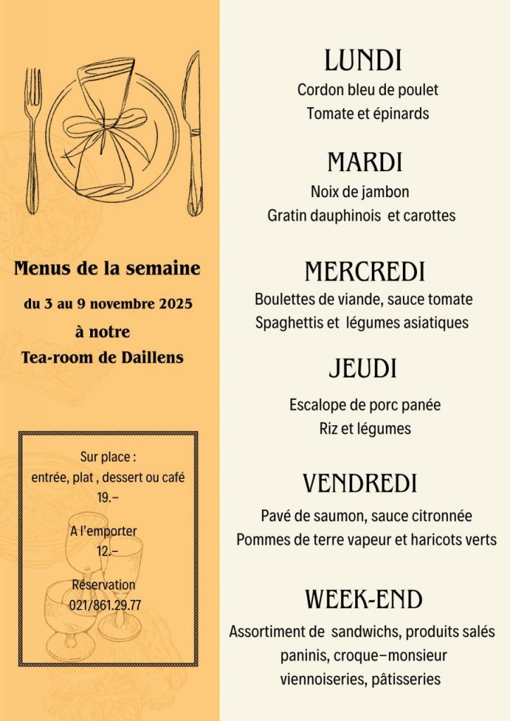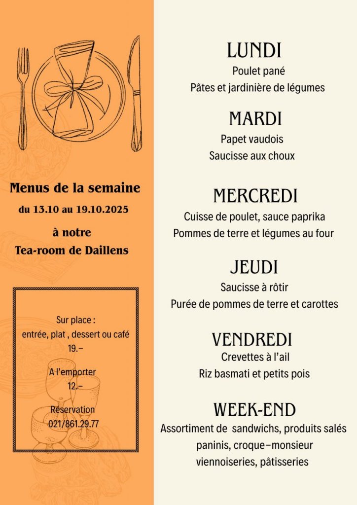 Notre tea-room à Daillens vous propose du lundi au vendredi à midi :